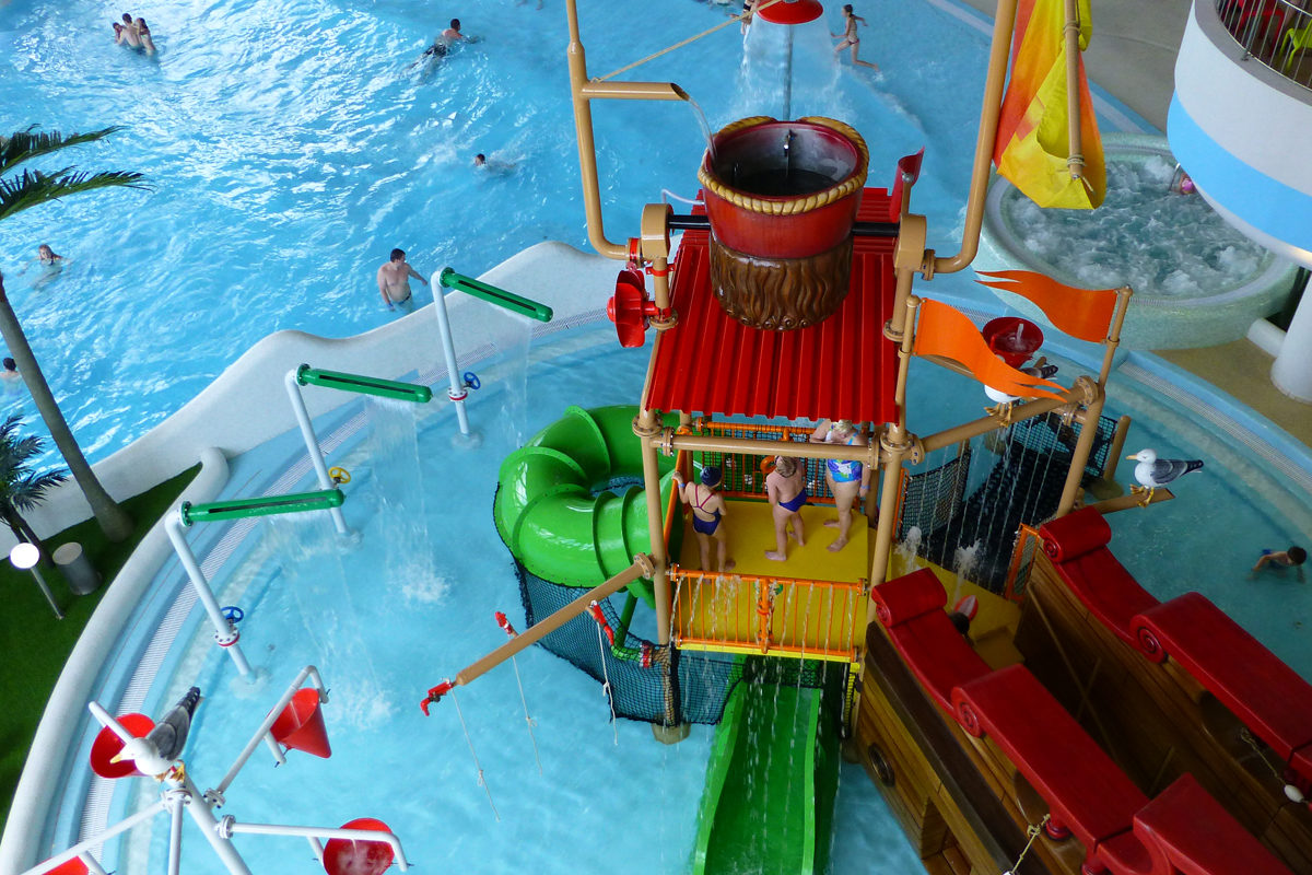Кстати, о детях. Для самых маленьких, чей рост еще не позволяет кататься на высоких горках, работает отдельная зона, а точнее водный игровой комплекс «Детский городок». В центре бассейна – гигантский пиратский корабль, с лесенками и лазалками, мачтой и небольшой горкой. Тут же установлен… водяной орган, на котором можно поиграть всем желающим. Работают аниматоры.
