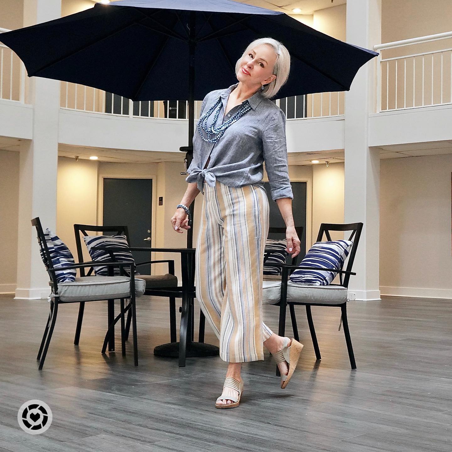 Так стилист Елена Галант на примере своей мамы показала, что лучше всего эта модель сочетается с однотонной майкой и льняной рубашкой. Потому что распахнутые борта рубашки создают вертикаль и вытягивают силуэт. А майка делает комплект более интеллектуальным и продуманным.