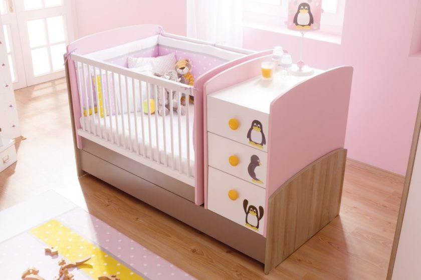 Кроватки могут быть оборудованы пеленальным столиком, ящиком для белья или сиденьем для мамы. При выборе модели следет исходить из параметров помещения, общего стиля комнаты и сочетания кроватки с другой мебелью.