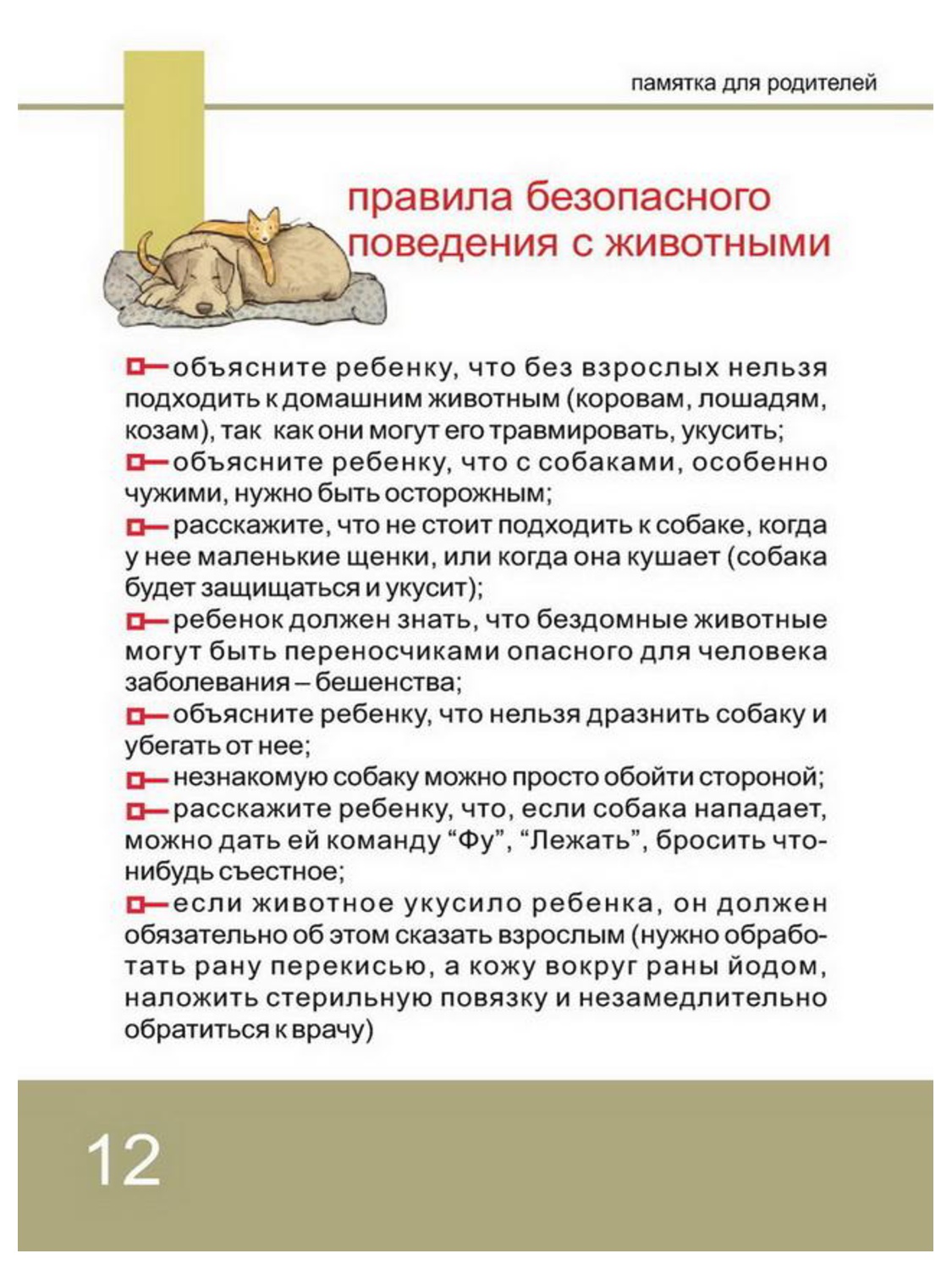 Детям нужно прививать не только любовь к животным, но и уважение к их способу жизни. Необходимо объяснить детям, что можно делать и чего нельзя допускать при контактах с животными. Например, можно кормить бездомных собак и кошек, но нельзя их трогать и брать на руки. Нельзя подходить к незнакомым собакам, беспокоить их во время сна, еды, ухода за щенками, отбирать то, во что играют собаки. Напоминайте детям, что и от кошек, и от собак передаются людям болезни – лишаи, чесотка, бешенство. После того, как погладил животное, обязательно нужно вымыть руки с мылом.