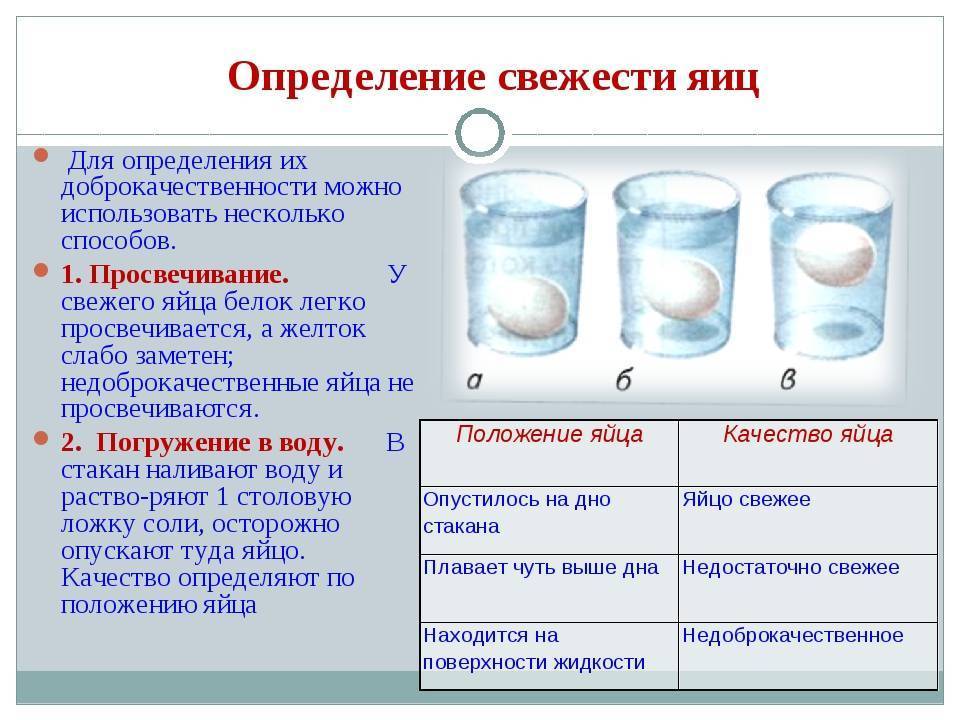Чтобы проверить яичко на свежесть, его нужно опустить в емкость с холодной водой. Если продукт свежий, то он должен опуститься на дно (по «возрасту» не старше недели), если нет – останется на поверхности. В последнем случае потреблять в пищу продукт нельзя никому: ни детям, ни взрослым