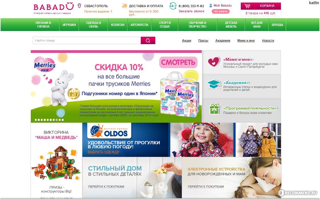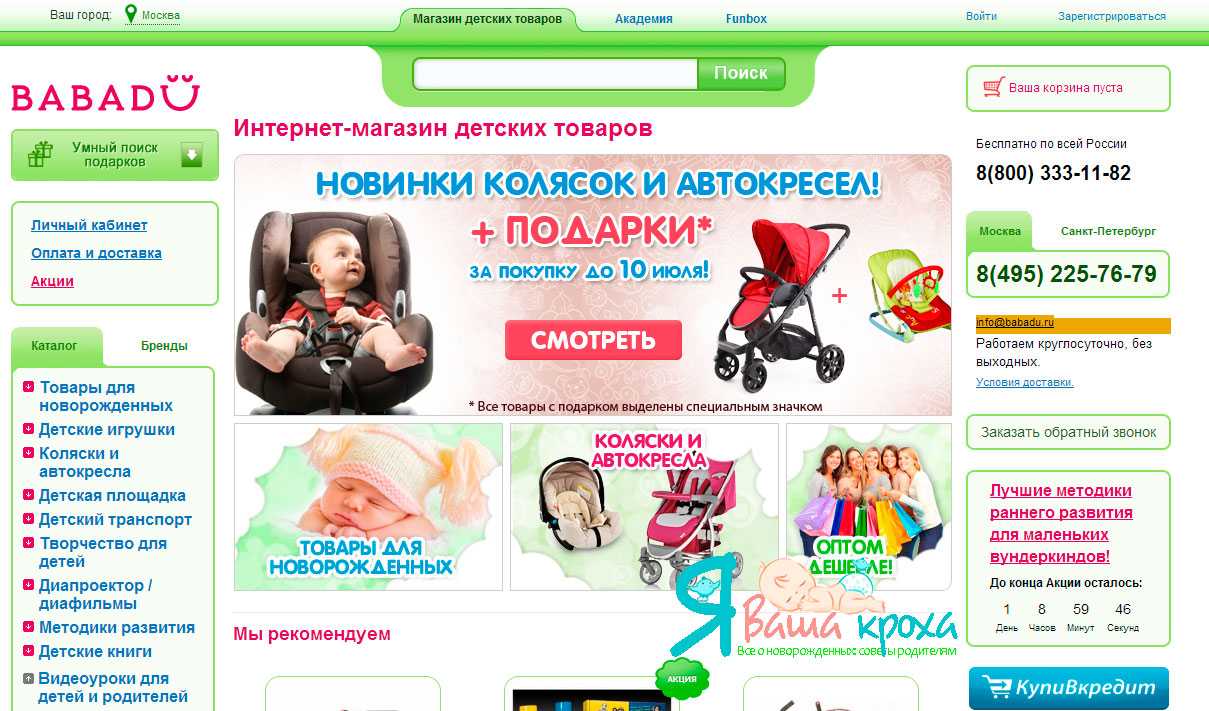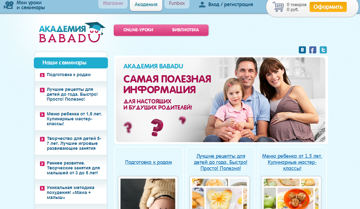 Отдельного упоминания стоит необходимый для любой молодой мамы сервис на сайте Babadu — Академия Babadu. В данном разделе есть онлайн-уроки, библиотека, обучающие видео-уроки, рецепты блюд для малышей, а так же множество советов на все случаи жизни. Это очень удобно, так как можно изучать необходимые материалы и уроки, не отрываясь от просмотра каталогов, что сильно сэкономит Ваше время.