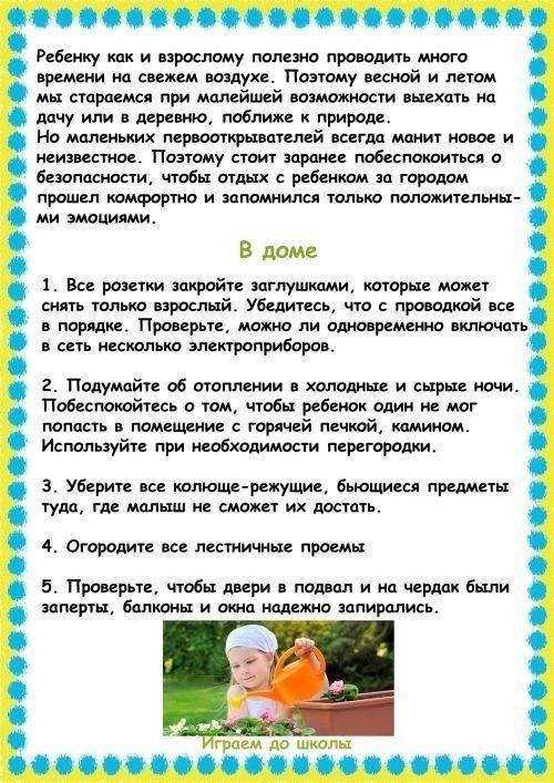 На даче опасность также представляют шаткие конструкции старых зданий, ветхий уличный туалет и открытые окна. Не позволяйте детям взбираться на крышу сарая или на развалины домов