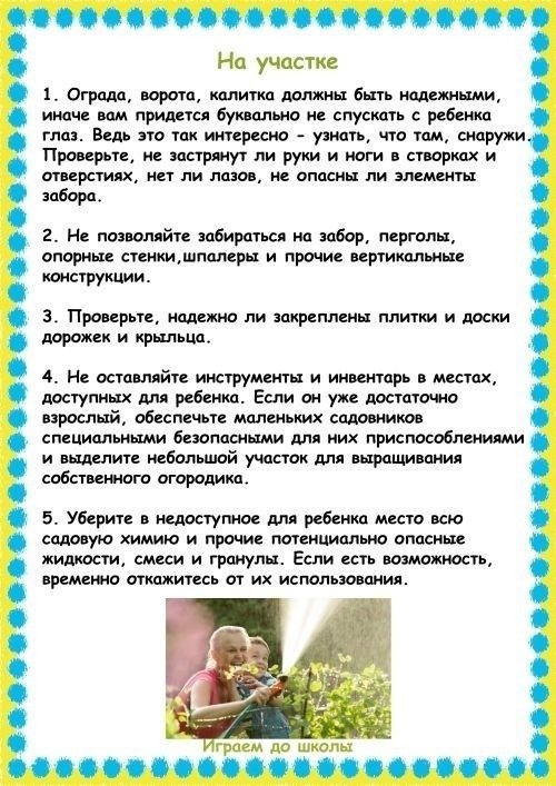 Пока вы рядом заняты делами на грядке, малыш может сорвать какие-то ягоды, листья, цветы и потянуть их в рот. За ребенком нужен присмотр. Объясните детям постарше правила поведения на дачном участке. Расскажите о том, что бывают ядовитые растения.