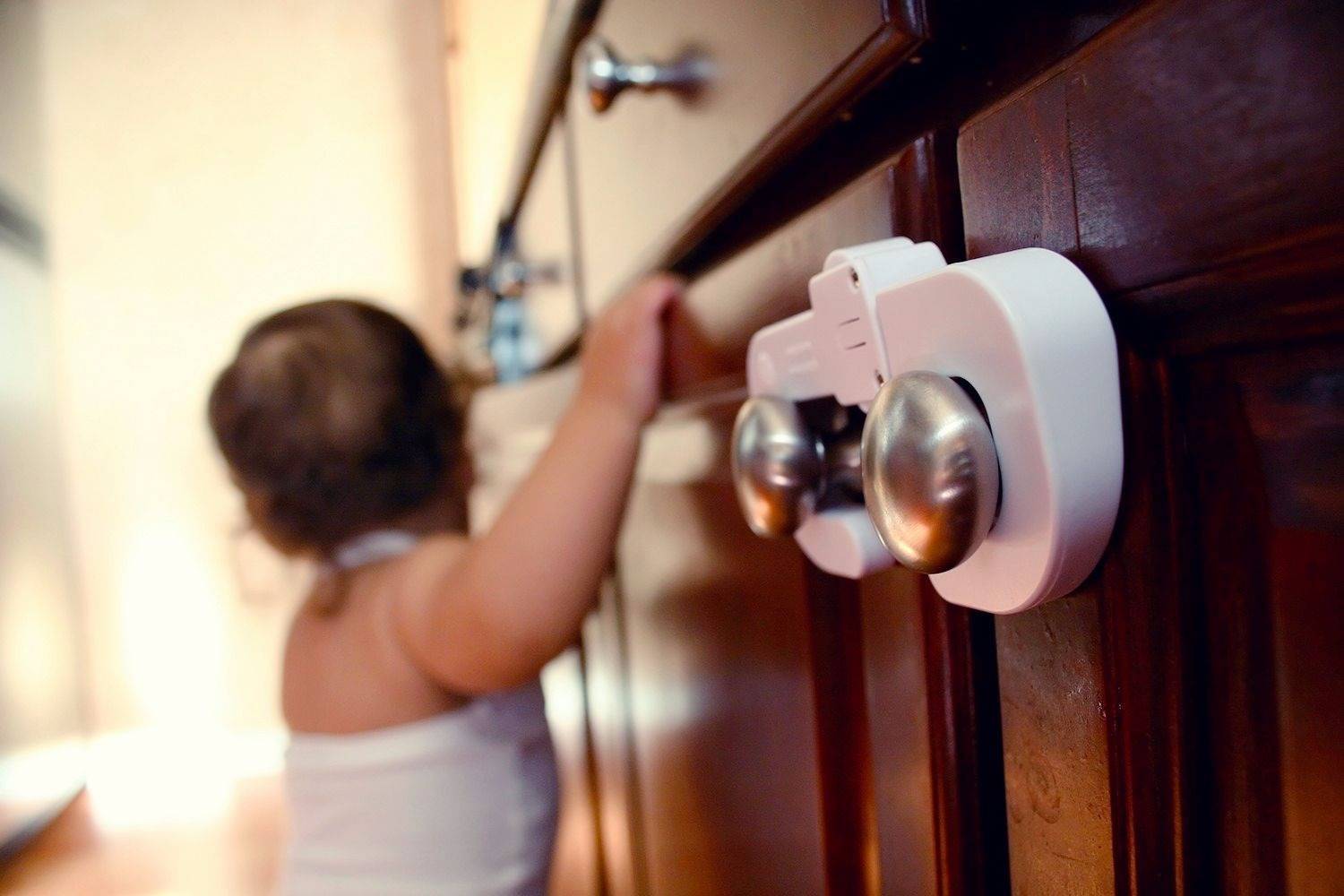 Из зоны доступа детей нужно убрать моющие средства, стиральные порошки и домашнюю аптечку. Часто бытовая химия хранится в шкафу под раковиной на кухне или в ванной комнате, но этого недостаточно — дверцы шкафа должны иметь замки-блокираторы. Для дополнительной подстраховки рекомендуется покупать хозяйственные средства и лекарства в емкостях, для которых предусмотрены защитные колпачки.