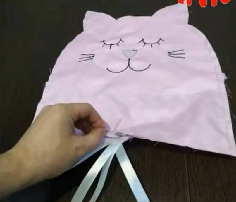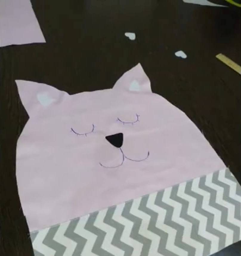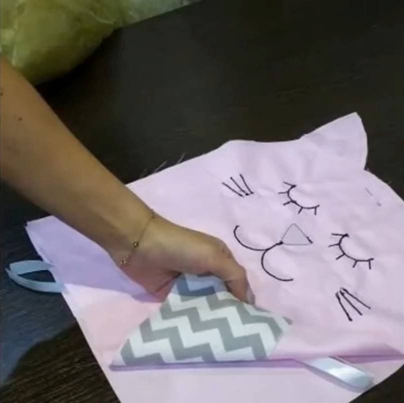 | 5 | ![]() | Затем вырежьте элементы мордочки зверюшки на отрезе фетра (уши, хвост) и прострочите их. Нарисуйте глаза, рот, усы на изделии с помощью мыла, мелка или терморучки, которая легко стирается. Для лучшей симметричности лучше воспользоваться линейкой. Далее прошейте толстым швом нарисованные черты лица. Сделайте щеки из фетра и прострочите их светлой нитью. |