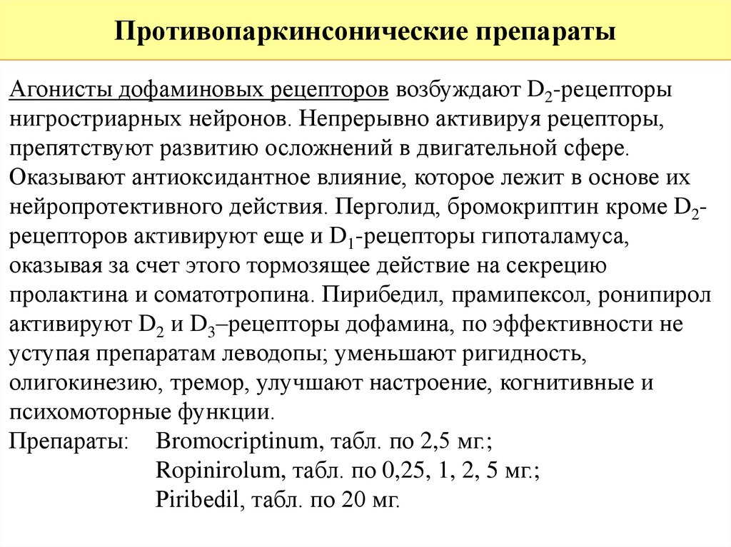 Описание противопаркинсонистических препаратов