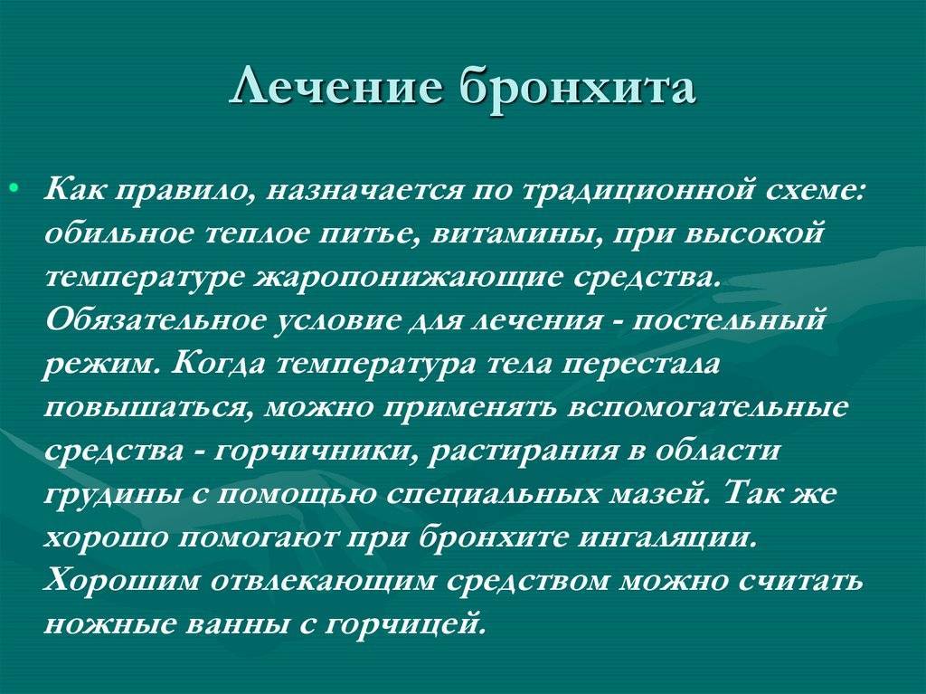 - Важную роль в лечении бронхита у женщины к период грудного вскармливания играет обильное питье. Нужно стараться пить только теплые напитки (исключая свежевыжатые соки, которые должны быть комнатной температуры), отдавая предпочтение чаям с добавлением лекарственных трав, теплому молоку, а также чаю с лимоном или имбирем.