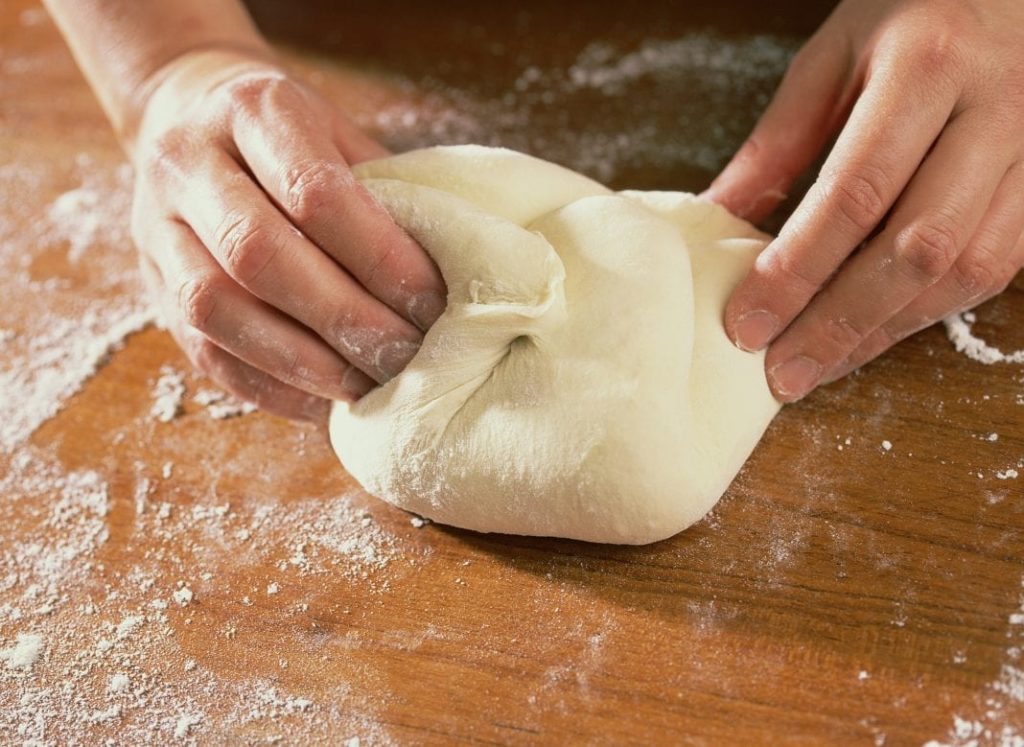 Такого материала получится довольно много, поэтому если нужна небольшая порция, следует уменьшить объем составляющих в несколько раз. Состав как у классического теста, только берется крупная соль вместо мелкой.