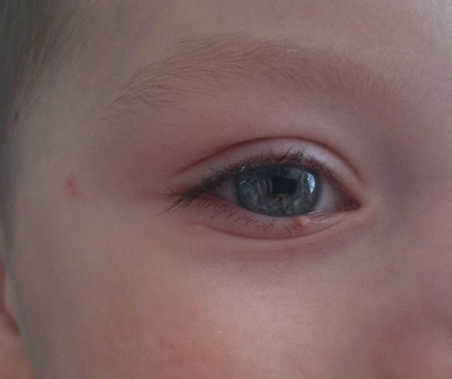Если сразу после рождения ребенка отмечается ярко-красный или бордово-розоватый оттенок век, возможная причина — доброкачественное образование под названием гемангиома (относится к родинкам).