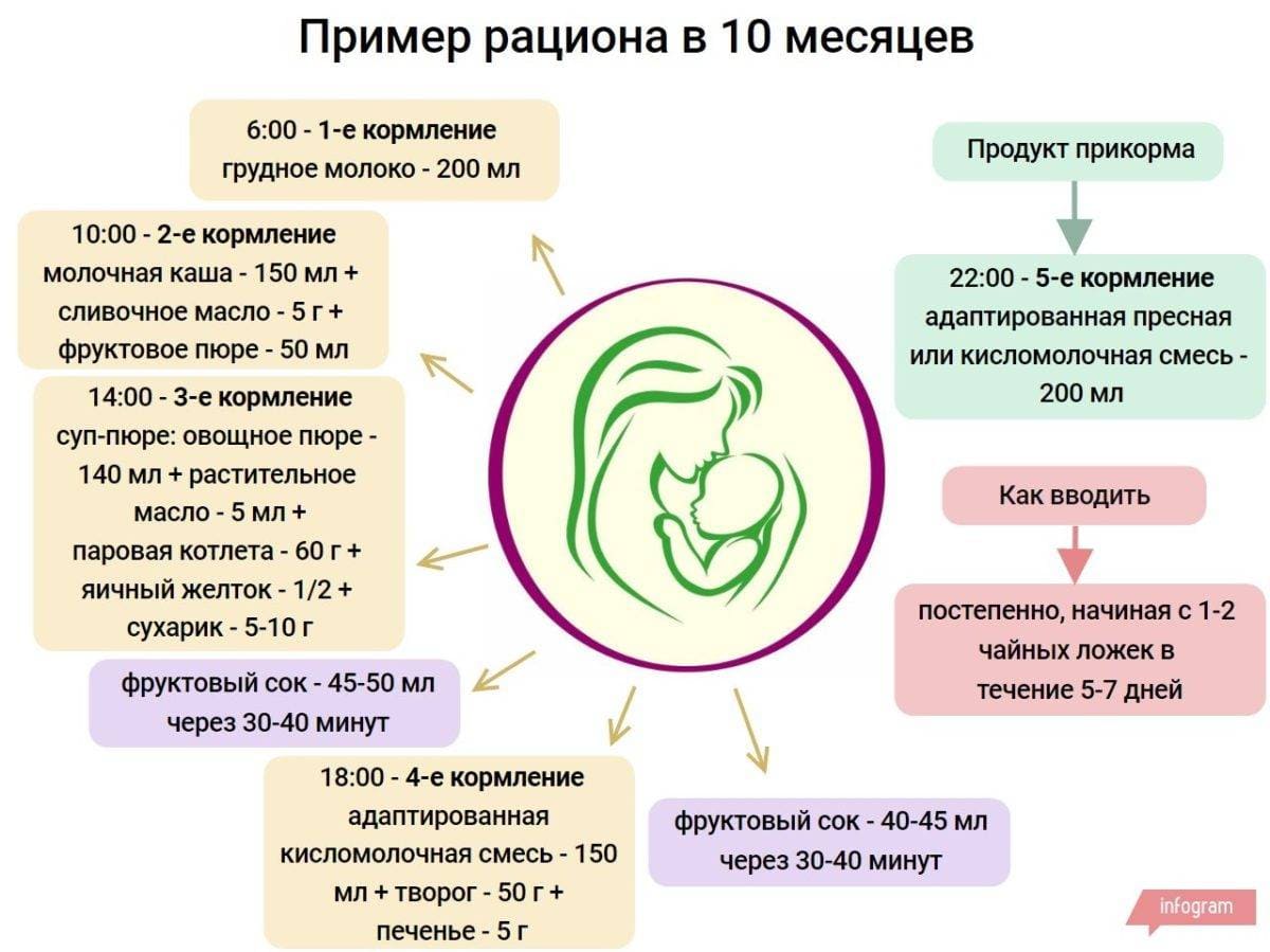 почти такое же, как у взрослого человека. Минимальная норма материнского молока составляет около 200 мл 2–3 раза в сутки. Остальное питание ребёнок получает в виде каш, пюре из фруктов и овощей, мясных бульонов, отварного мяса, рыбы, супов. Некоторые мамы с 10 месяцев перестают готовить отдельно для ребёнка, предпочитая исключить нежелательные продукты из собственного рациона. В этом возрасте кроха не должен кушать острые приправы, какао, кофе, жареное мясо, копчёности. Желательно убрать из его рациона магазинные продукты, содержащие консерванты и потому имеющие большой срок хранения.