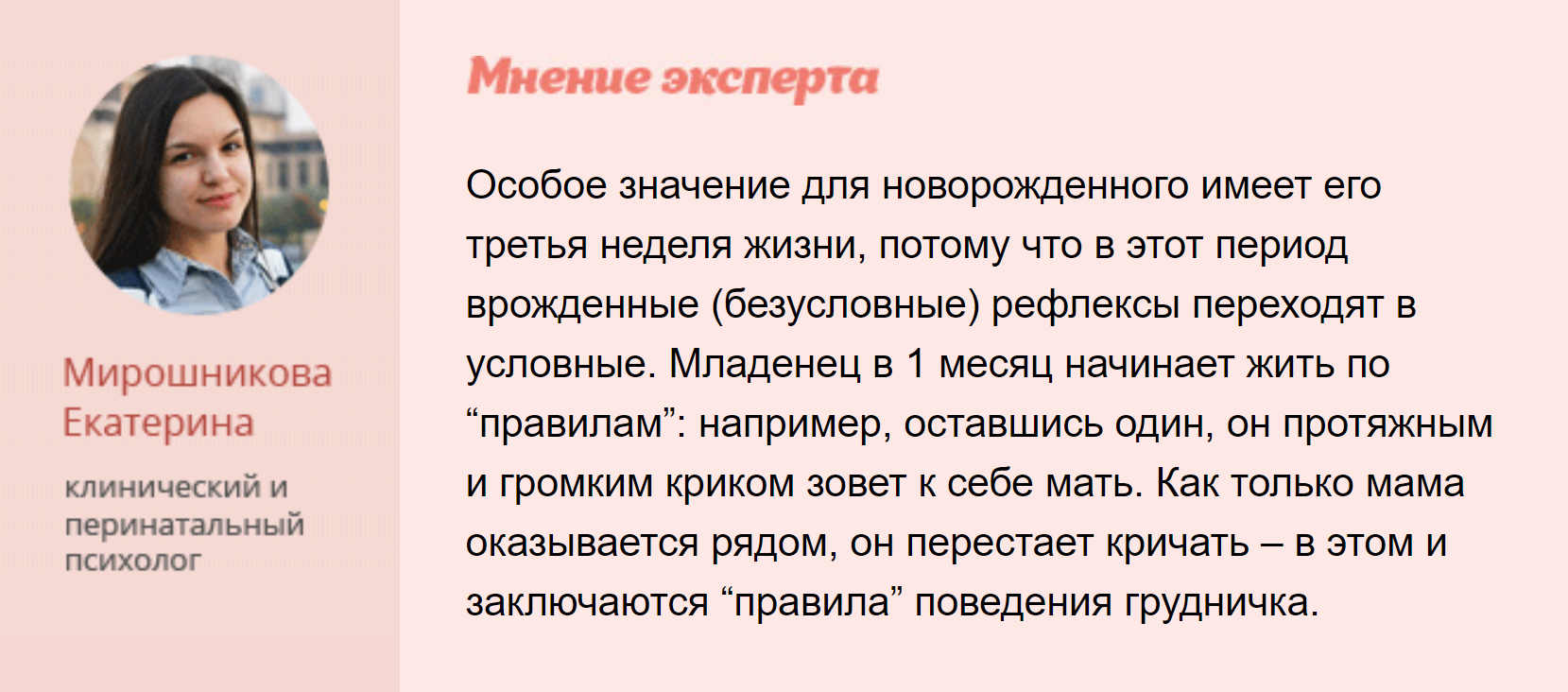 | Интеллект | Началось сенсорное развитие крохи (чувственно-двигательное). Сейчас он отрабатывает данные ему с рождения навыки: сосание, реагирование на звуки, световые раздражители, температуру. Вырабатываются первые условные (не врожденные) рефлексы. |