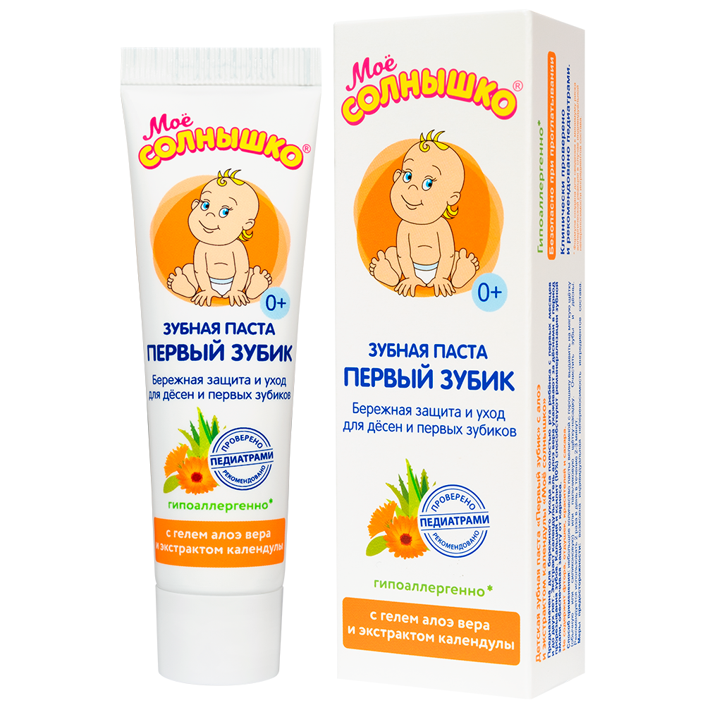 В качестве первой зубной пасты для малыша отлично подойдет зубная паста «Первый зубик»: она содержит экстракт календулы и гель алоэ вера, что позволяет бережно ухаживать за деснами в период прорезывания зубов. Кальций и ксилит (10%) в составе способствуют реминерализации эмали и обеспечивают защиту первых 16 зубов малыша от кариеса.