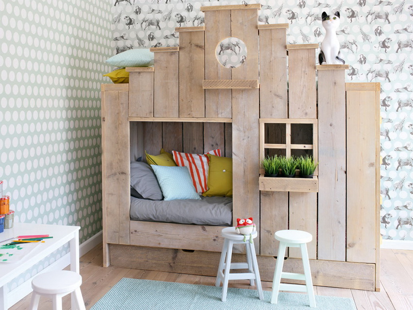 Игровой дом из дерева позволит родителям полностью переконструировать детскую комнату, поскольку надёжность игрушки обеспечивает возможность разместить домик не горизонтально, а по вертикали.