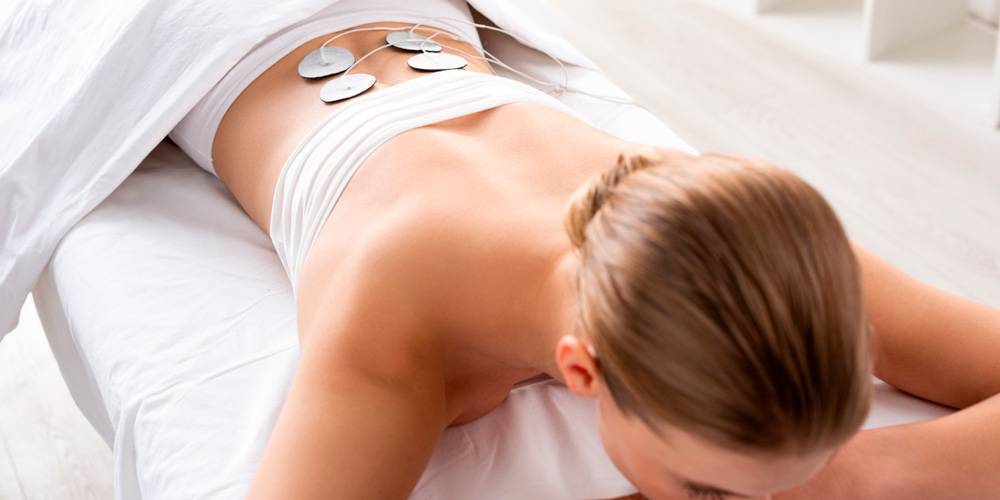 - При грыже поясничного отдела — используют метод раздвоенных электродов: (+) крепят на пояснице, раздвоенный (два электрода) (-) крепят на ногах – в области задней части бедер или икр.