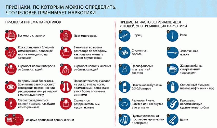 В зависимости от типа наркотика симптомы наркотического отравления разнятся. Относительно близкого человека можно определить лишь косвенные признаки. В зависимости от типа воздействия наркотика, его состава и природы симптоматика бывает противоположной. Так, при стимуляторах у наркомана увеличивается мышечная активность, что может развиться в судороги. При приеме транквилизаторов и сходных по действию препаратов определяется заторможенность и «зависание».Как распознать, что человек находится под действием веществ: