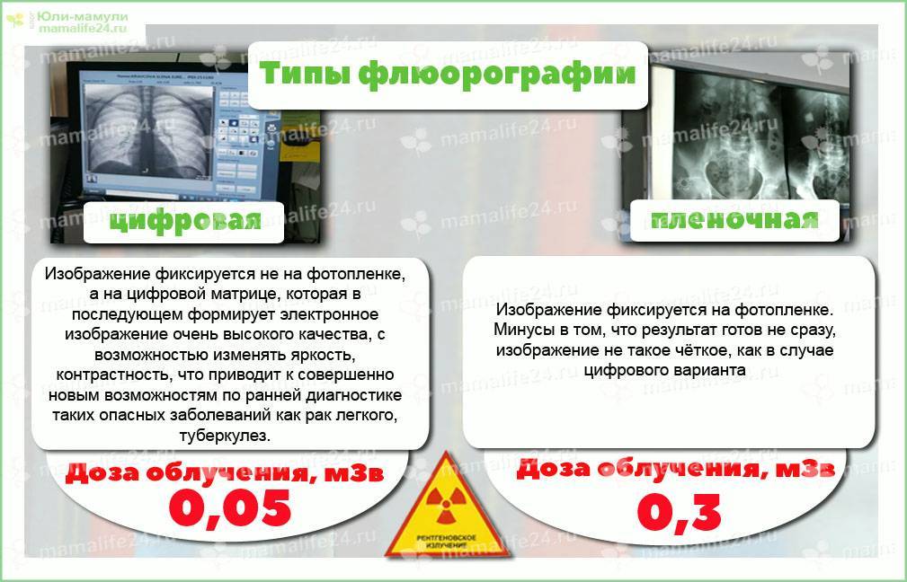 Стоит отметить, что люди, у которых нет каких-либо жалоб на здоровье должны проходить флюорографическое обследование не чаще чем раз в год, так как во время данной процедуры в организм попадает определенная доза облучения. Именно это и является одной из главных причин отказа будущих мам от флюорографии.