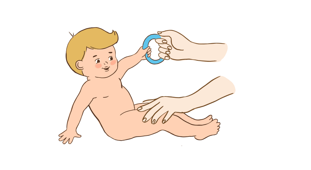 Вложите кольцо в левую ручку ребенкаи начните отводить ее до прямого угла, при этом придерживая колени малыша. Затем попросите его сесть — ребенокбудет садиться с упором на правую руку. В конце упражнения— возвращение в исходное положение. Выполнить три раза.