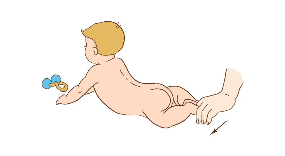 - Двумя пальцами свободной руки нужно провести по позвоночнику, начиная от крестца до шеи, а после двигаться в обратном направлении. При этом должна наблюдаться рефлекторная реакция – ребенок должен слегка выпрямиться.