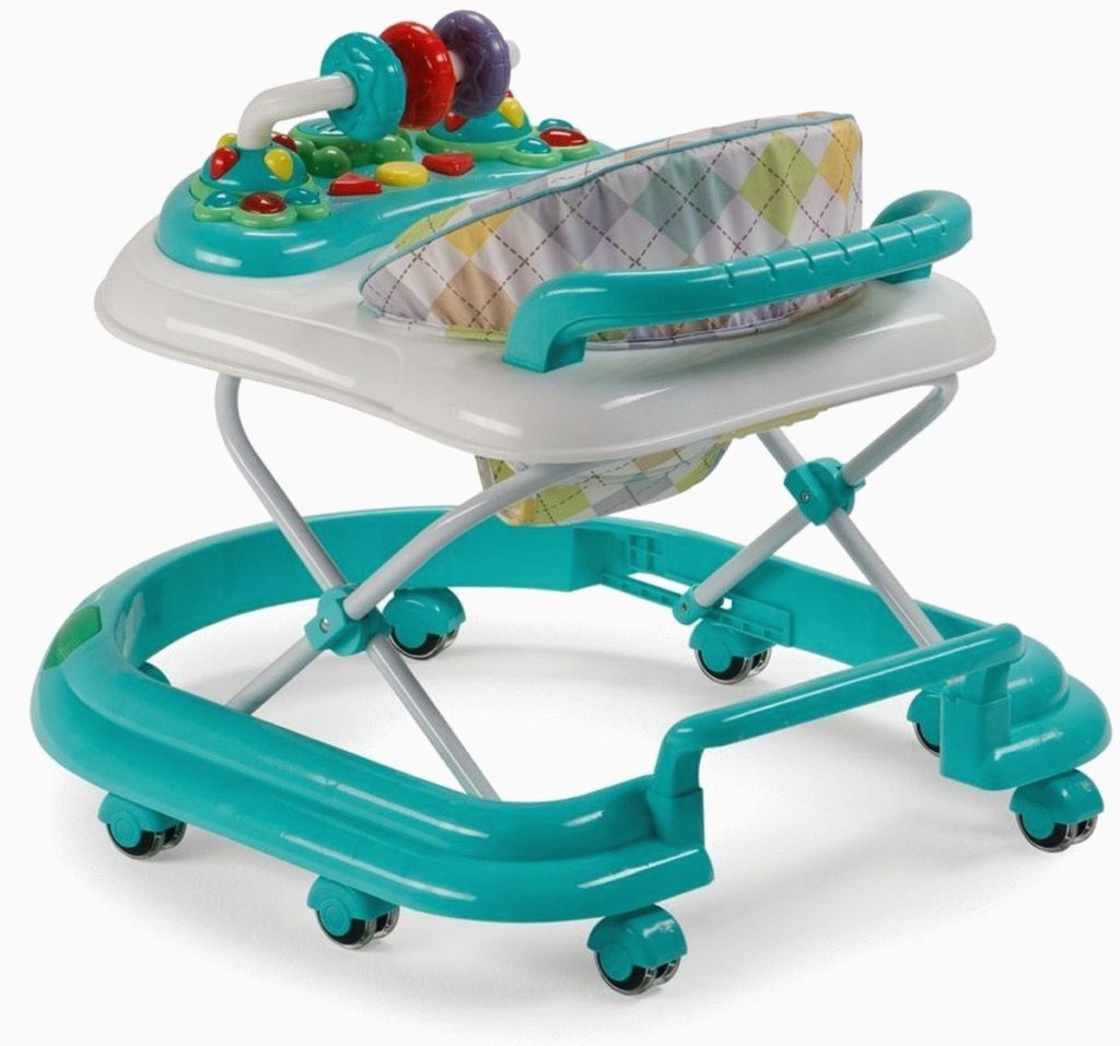 Выбирайте большие колеса, которые крутятся во все стороны и располагаются по всему основанию. Чем больше колес, тем лучше. Подходящим количеством станет 6-8 пар. Хорошо, если конструкция предусматривает блокировку колес, которая позволит превратить ходунки в игровой столик или стол для кормления.