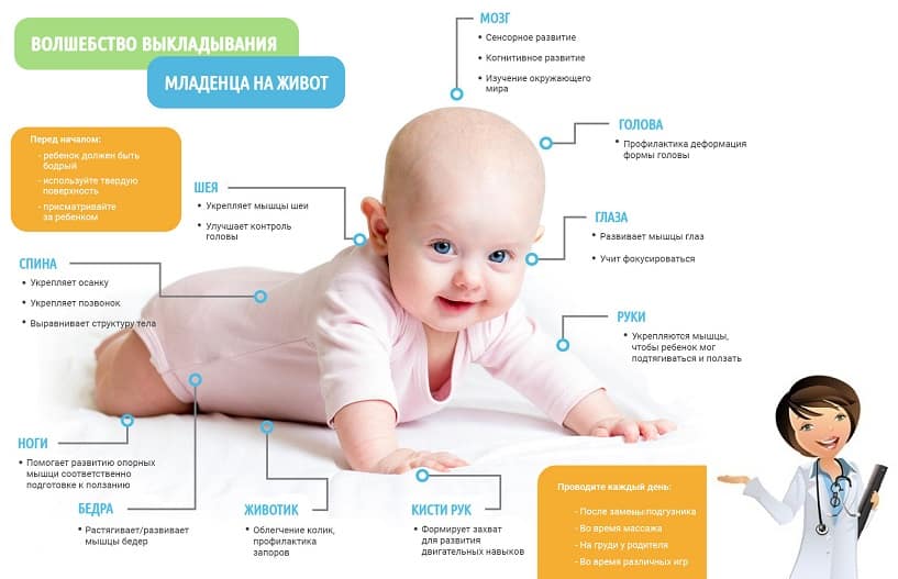 Современные педиатры считают, что новорожденного можно выкладывать на живот с самого рождения. Устоявшееся ранее мнение о том, что это помешает заживлению пупочной ранки, сегодня считается спорным. Тем более что сначала эти процедуры проводятся в течение 1-2 минут, вряд ли это время можно назвать критичным для ранки.