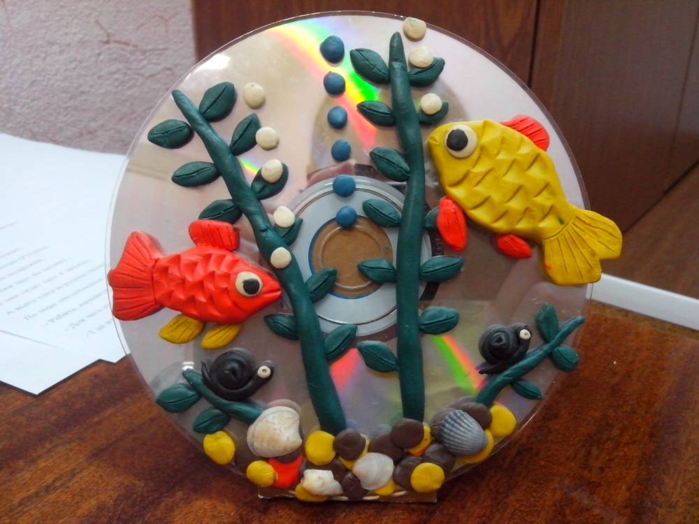 Из другого кусочка пластилина сделайте треугольники прикрепите его к овалу. Получится хвостик рыбки. Место стыка хорошо разравняйте. Палочкой или крохотными шариками черного цвета обозначьте глазки.