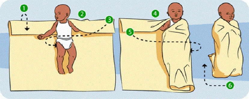 Ребенка запеленывают как в кокон, руки во время процедуры слегка прижимают к телу. Туго запеленатый ребенок полностью ограничен в движении.