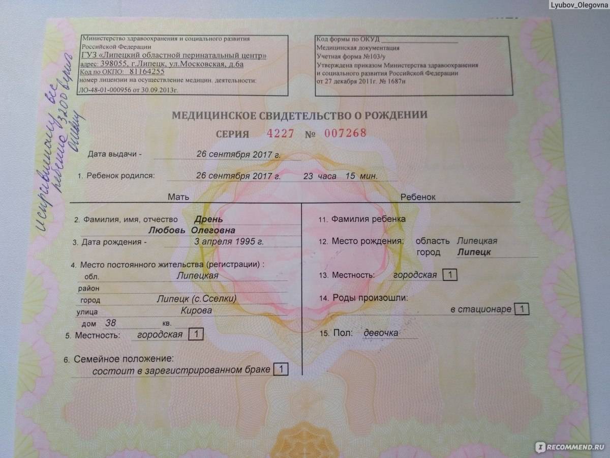 - медицинское свидетельство о рождении, выданное в роддоме;