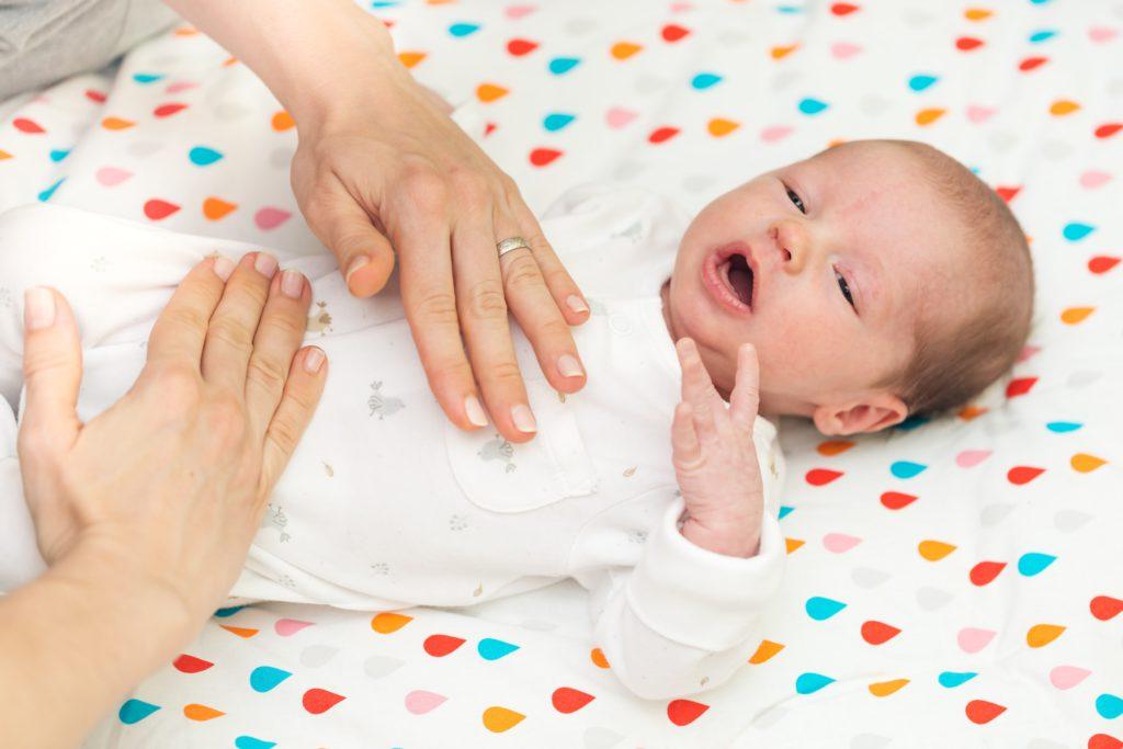 Положите тёплые ладони на животик ребёнка и подержите около минуты