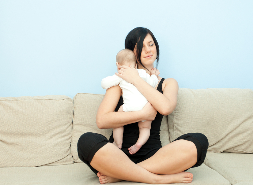 Малыш лежит на боку, а его ножки — под маминой подмышкой