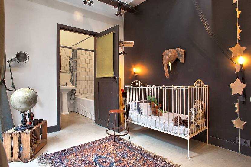 Особенность данного стиля заключается в небрежной отделке и наличии грубых поверхностей. Детская для новорожденного в стиле лофт выдержана в серых, белых, бежевых и терракотовых тонах, однако допускается и пастельная гамма, которая зрительно расширяет пространство. Детская комната для младенца – это помещение, где нежелательно использовать чрезмерно темные и мрачные тона, так как они могут угнетать его настроение.