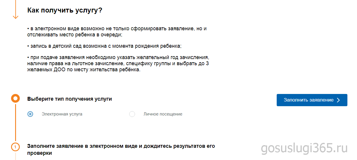 Среди типов получения услуги выберите «Электронная услуга». При выборе пункта «Личное посещение» сайт только расскажет, какие документы понадобятся, чтобы встать в очередь в общем порядке.