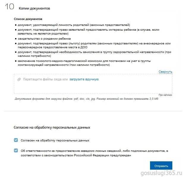 Таким образом родители подают заявку, чтобы поставить малыша на учёт. Однако на этом процедура не заканчивается, нужно ещё загрузить на портал все необходимые документы.