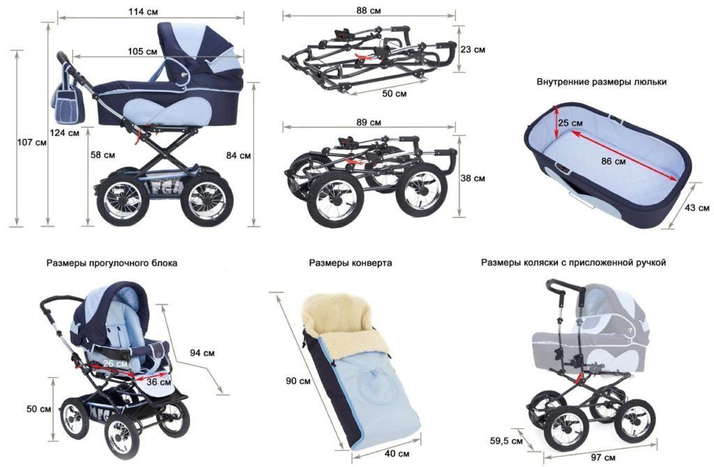 Измерять коляску нужно по размеру матраса, потому что люльку делают конусообразной и верхние края коляски могут быть больше. Некоторые производители указывают размеры по верхнему краю. Нужно замерять самостоятельно.