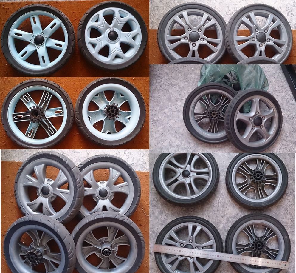- Для разбитых дорог лучше подойдут резиновые колёса, по снегу отлично едут большие пластиковые.