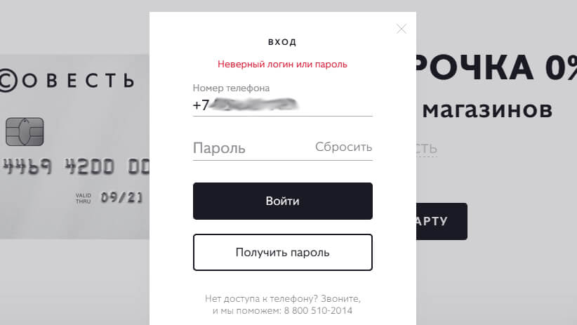 Как и в предыдущем случае, решить проблему восстановления пароля могут только консультанты техподдержки сайта карты «Совесть», отправив ксерокопию документов и новый номер мобильного телефона на электронную почту help@sovest.ru.