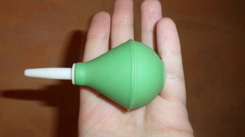 У детей до 4–5 лет обычно используют спринцовку. Это резиновая груша с мягким наконечником. В аптеках продаются различные разновидности спринцовок, которые отличаются объемом. Для новорожденных малышей и грудничков обычно используют резиновые груши, в которые вмещается до 30 мл жидкости. Крохам после года ставят клизмы объемом до 360 мл воды.