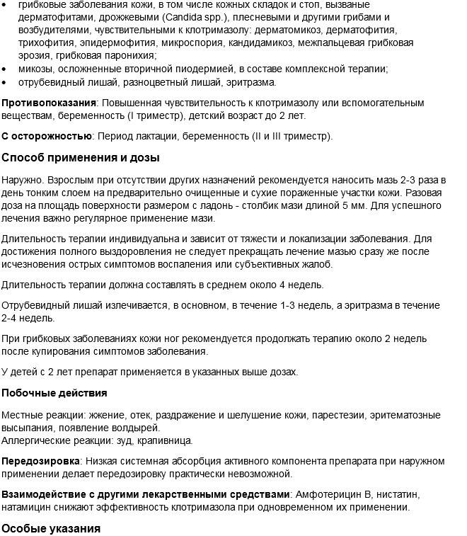 Начиная с II триместра беременности и в период лактации, противогрибковый препарат используют с осторожностью, под контролем врача. Клотримазол вызывает побочные явления в единичных случаях, проявляются они зудом, жжением, волдырями, отёчностью. Продолжить этот список можно шелушением, покалыванием (после применения мази) и покраснением