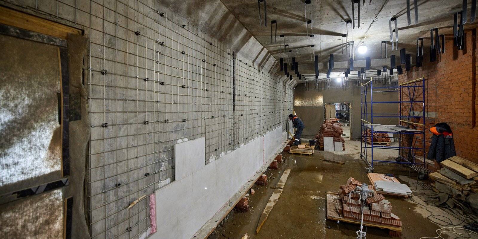«Воронцовская» — станция островного типа, пути проходят по обеим сторонам перрона. Сейчас платформа — это череда железобетонных стен и колонн. Инженер, стоя у рельсов, направляет на колонну красный луч из прямоугольной коробки на штативе. Это лазерный нивелир, его луч помогает точно отмерить расстояние для укладки облицовочных плит.