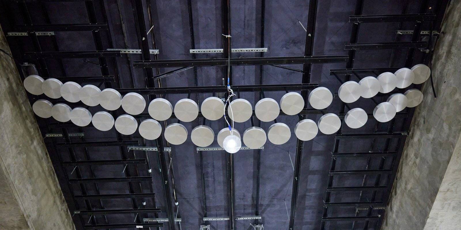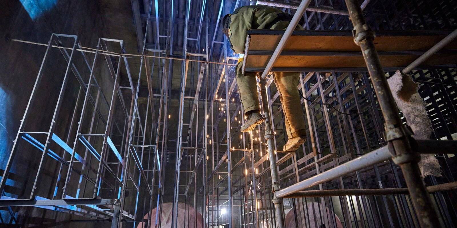 От пола до потолка под платформой возвышается клетка. На ней рабочий сваривает металлические трубы. Александр говорит, что здесь будут кассеты глушения: поезда не бесшумны и, чтобы пассажиры не слышали их, под платформой глушатся все звуки.
