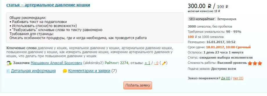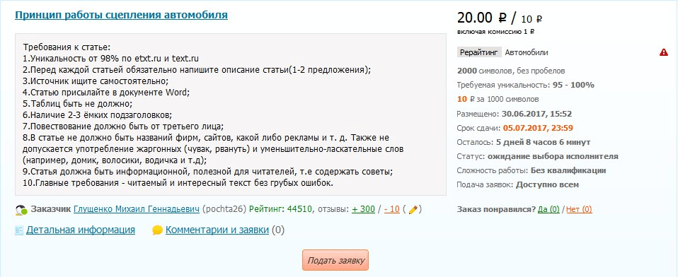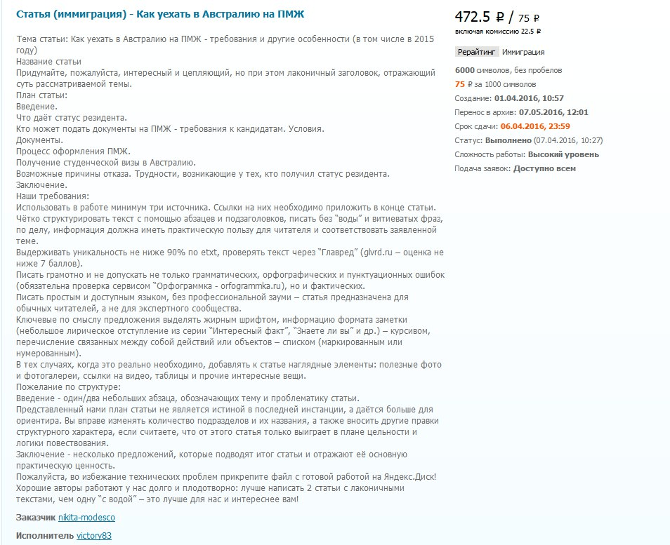 Но вернемся к бирже. Первый мой заказ был, как сейчас помню, в первый же день после регистрации, 1 апреля. Вот он: