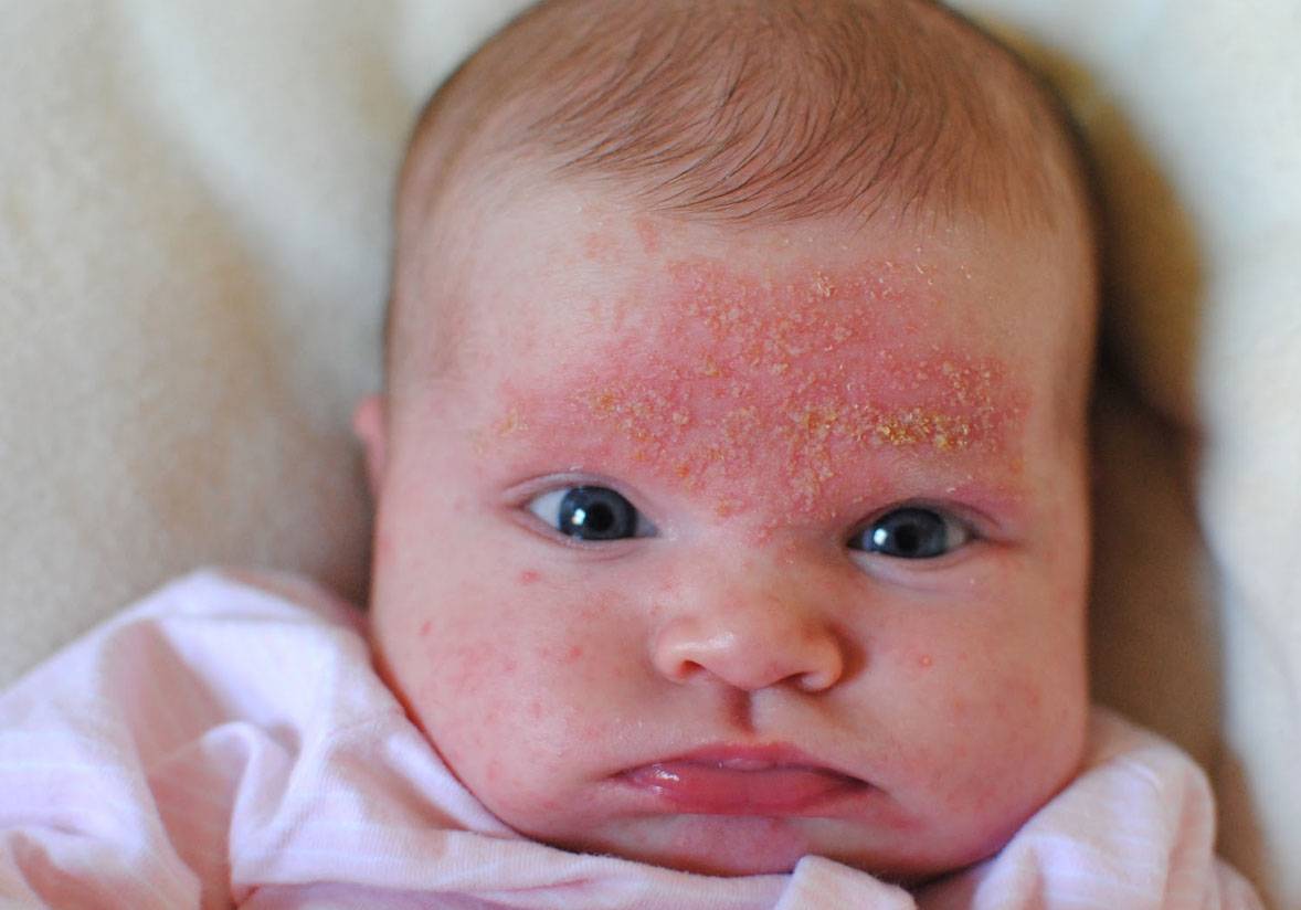На первом этапе заболевания изменения затрагивают кожу головы, где вы замечаете себорейные чешуйки. После болезнь распространяется по телу, появляются опрелости, от которых сложно избавиться. Диатез «атакует» щеки.
