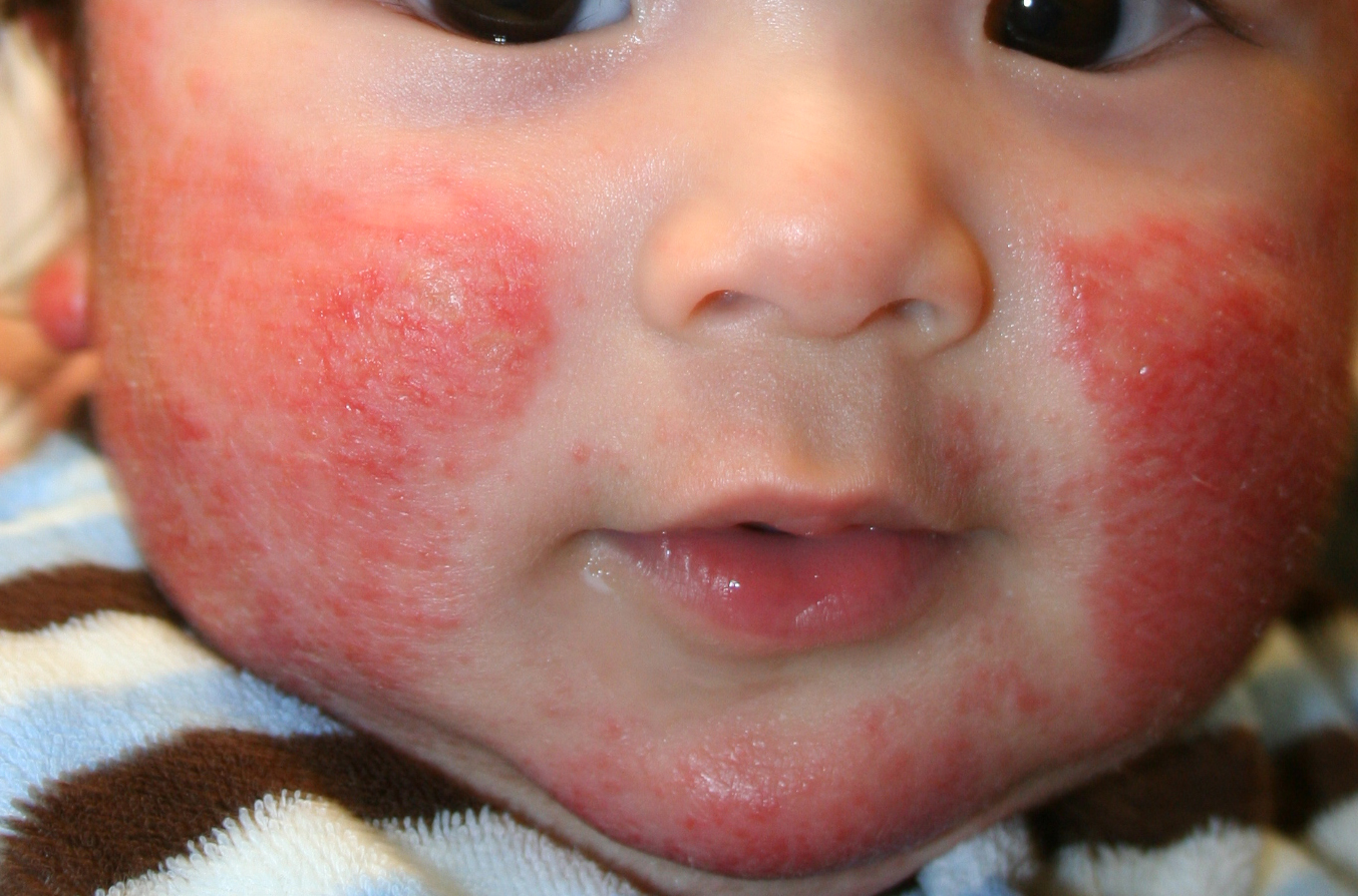 При экземе кожа ребенка сильно зудит. Первые признаки появляются на лице, на ступнях и локтях, после распространяются по телу. Экзема проявляется грубыми бляшками красно-бордовой расцветки. Шершавость остается даже, когда краснота уменьшится. Если ребенок будет расчесывать пораженные места, то на них после выздоровления появится корочка. Как правило, надлежащее лечение убирает болезнь бесследно, реже она становится хронической.