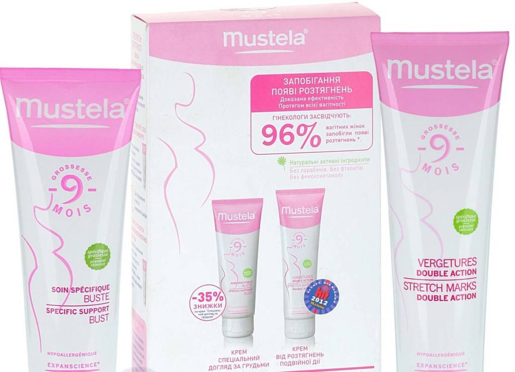 - Mustela. Содержит пептиды авокадо, масло ши, экстракт японской софоры, лупеол, арабиногалактан, эласторегулятор, витаминно-минеральный комплекс. Предполагает стимулирование синтеза эластина и коллагена, увеличивает сопротивляемость кожного покрова к натяжению, обладает отшелушивающим и увлажняющим эффектом. Присутствует противовоспалительное действие. Способствует обесцвечиванию стрий, характеризуется необычным запахом, считается профилактическим средством;