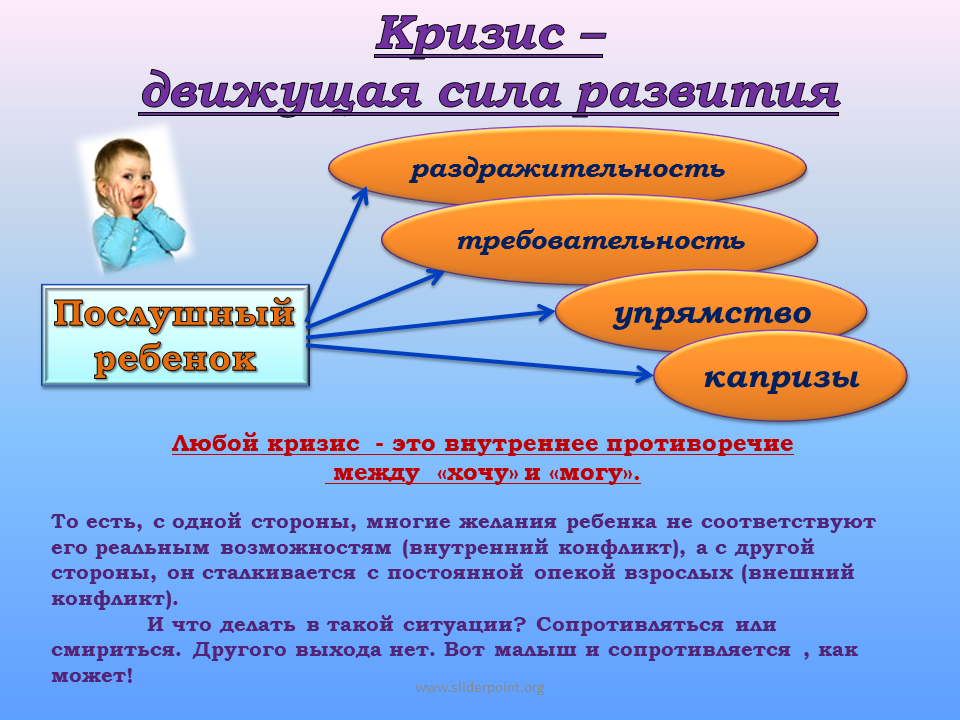 Нужно понимать, что для ребенка в период кризиса трех лет такой симптом, как упрямство, — это результат сложных психологических процессов, имеющих в конечном итоге позитивное наполнение: он отстаивает свои интересы, свое мнение. Пусть пока и неуклюже, но отстаивает. Нелепо сердиться на ребенка за то, что требования еще незрелые, но сам процесс вполне уместен и в возрасте 3 лет, и в будущем. Наверное, мало кто хотел бы воспитать ребенка, не умеющего отстаивать свое мнение, подчиняющегося только чужому. В таком случае давайте с пониманием отнесемся к первым, пусть и абсурдным, попыткам сделать это. Преодолевая кризис трех лет в период раннего детства, когда у вас возникнет импульс жестко пресечь упрямство ребенка, дабы показать ему, кто в доме хозяин, подумайте, действительно ли покорность — то самое качество, которое вы желали бы видеть у ребенка в будущем?