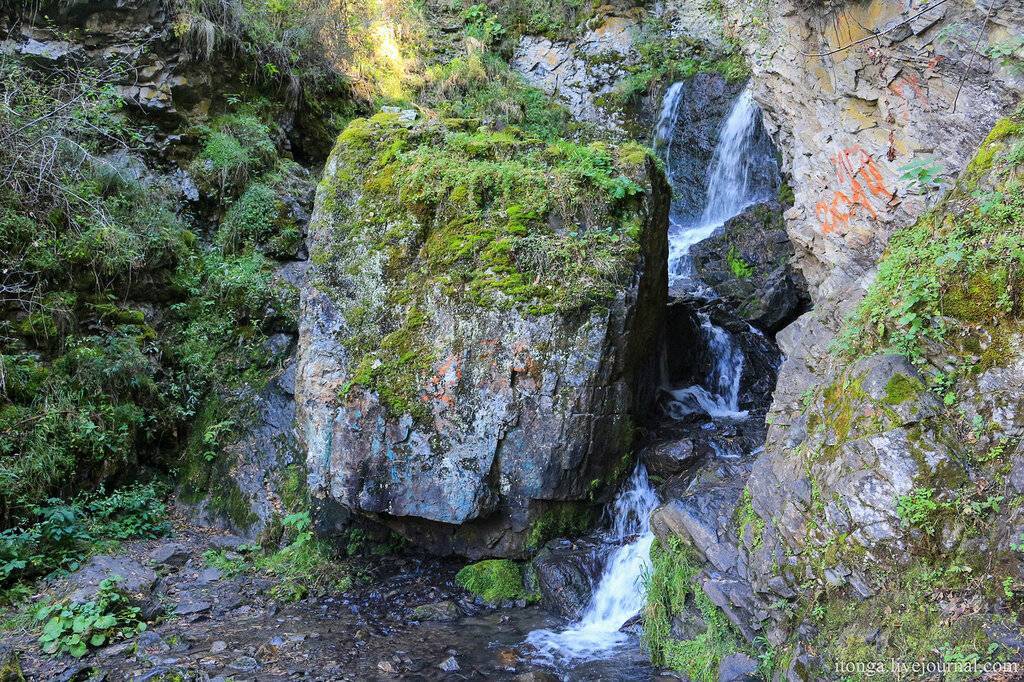 Проехав через Майму и миновав поворот на Горно-Алтайск я едва не проехал мимо первого места из тех, что планировали посмотреть на Алтае. Уточнив начало тропы через лес, вдоль ручья поросшего мхом мы отправились на Черемшанский водопад.