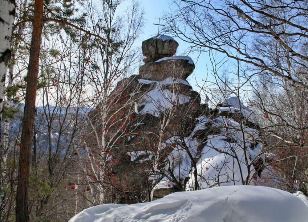 От сюда на машине мы сделали небольшой крюк и поднялись на гору. Там есть лестница, можно было подняться самостоятельно, но мы хотели посмотреть на Алтае как можно больше мест, так что не стали тратить время, а доехали на автомобиле. Наверху находится .