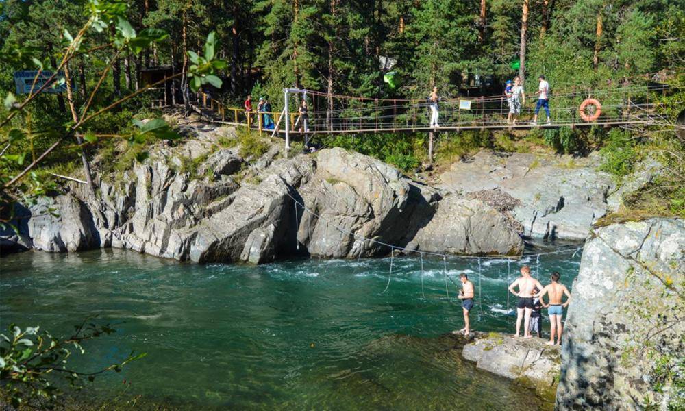 Есть здесь многоуровневый веревочный городок, с максимальной высотой в 4 м. На тарзанке можно отправиться в свободный полет над рекой Чемал, при желании, можно выбрать вариант с окунанием в ледяную воду.