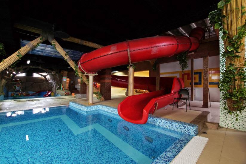 Здесь есть водные аттракционы, горки, водные пушки, бассейн с гейзерами, джакузи и банный комплекс с самыми популярными видами русской, финской и турецкой бань.
