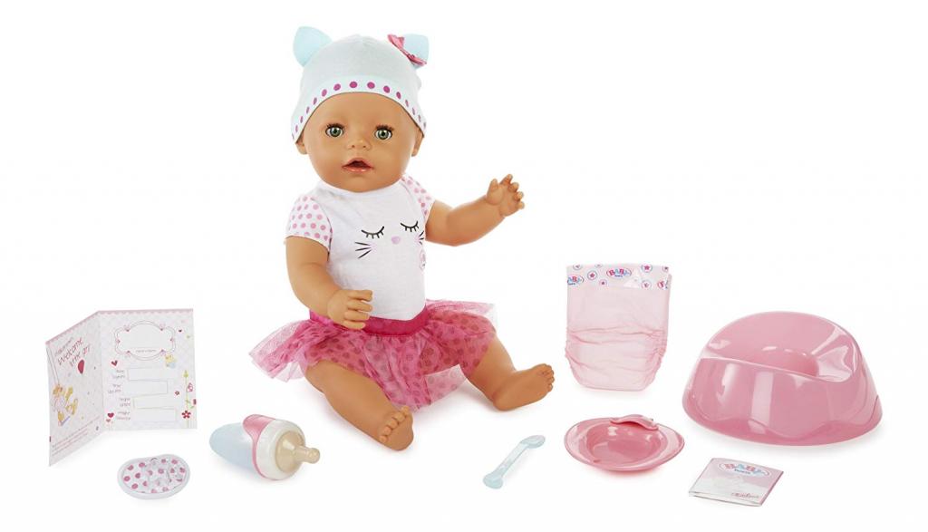 Интерактивная кукла для девочек сделана немецкой компанией, которая специализируется на производстве функциональных младенцев, которые могут ходить на горшок и есть. По внешнему виду игрушка относится к куклам-младенцам. Он может писать, какать, пить и плакать. На ней красивое бледно-розовое платье с разноцветными аппликациями (бабочки и цветы) на груди. Бумажная корона того же цвета и 2 браслета создают элегантный образ. Этот материал имеет свои недостатки, так как может быстро разрушаться при контакте с водой. Для завершения образа в комплект входят туфли с закругленным краем.